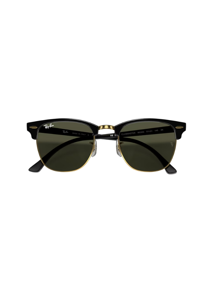 Color y material: montura combinada en acetato negro con estructura metálica dorada y lentes verdes clásicos Ray-Ban.