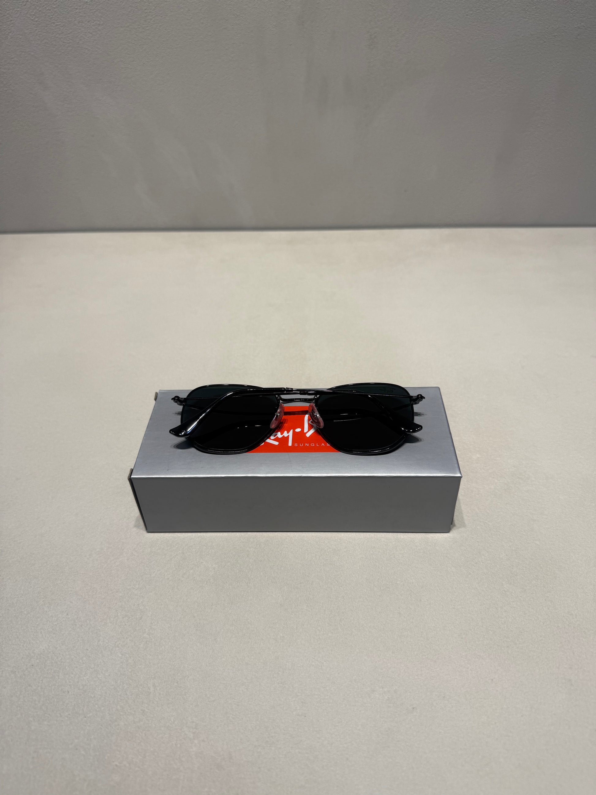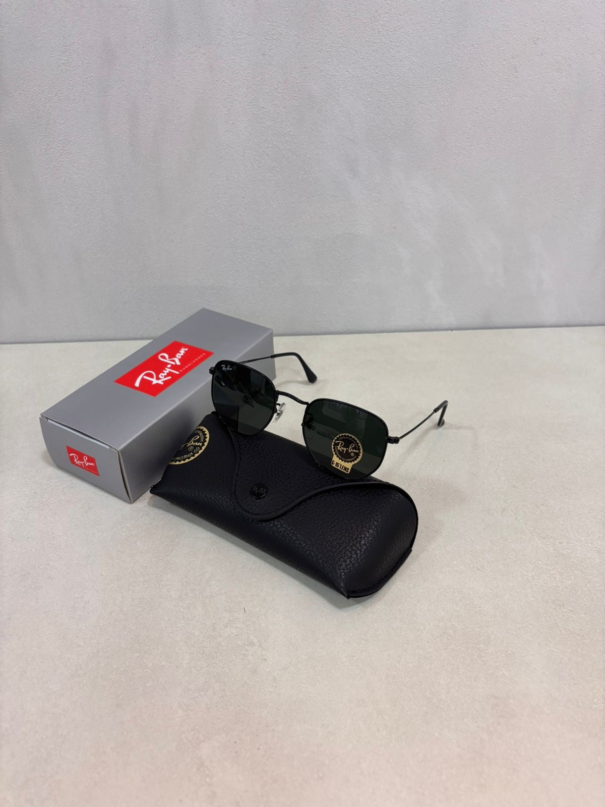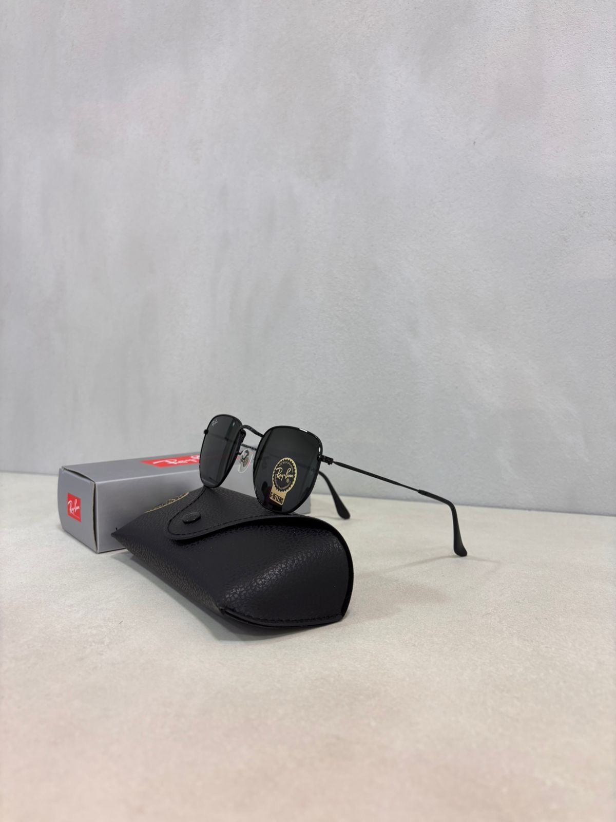 Acabados y detalles: logotipo de Ray-Ban grabado discretamente en la lente derecha y acabados en negro pulido; incluye estuche oficial y paño de limpieza.