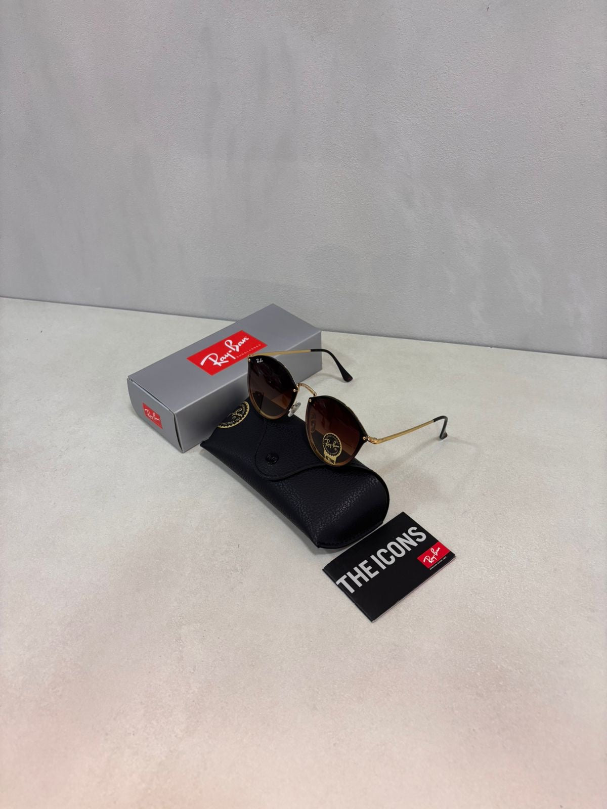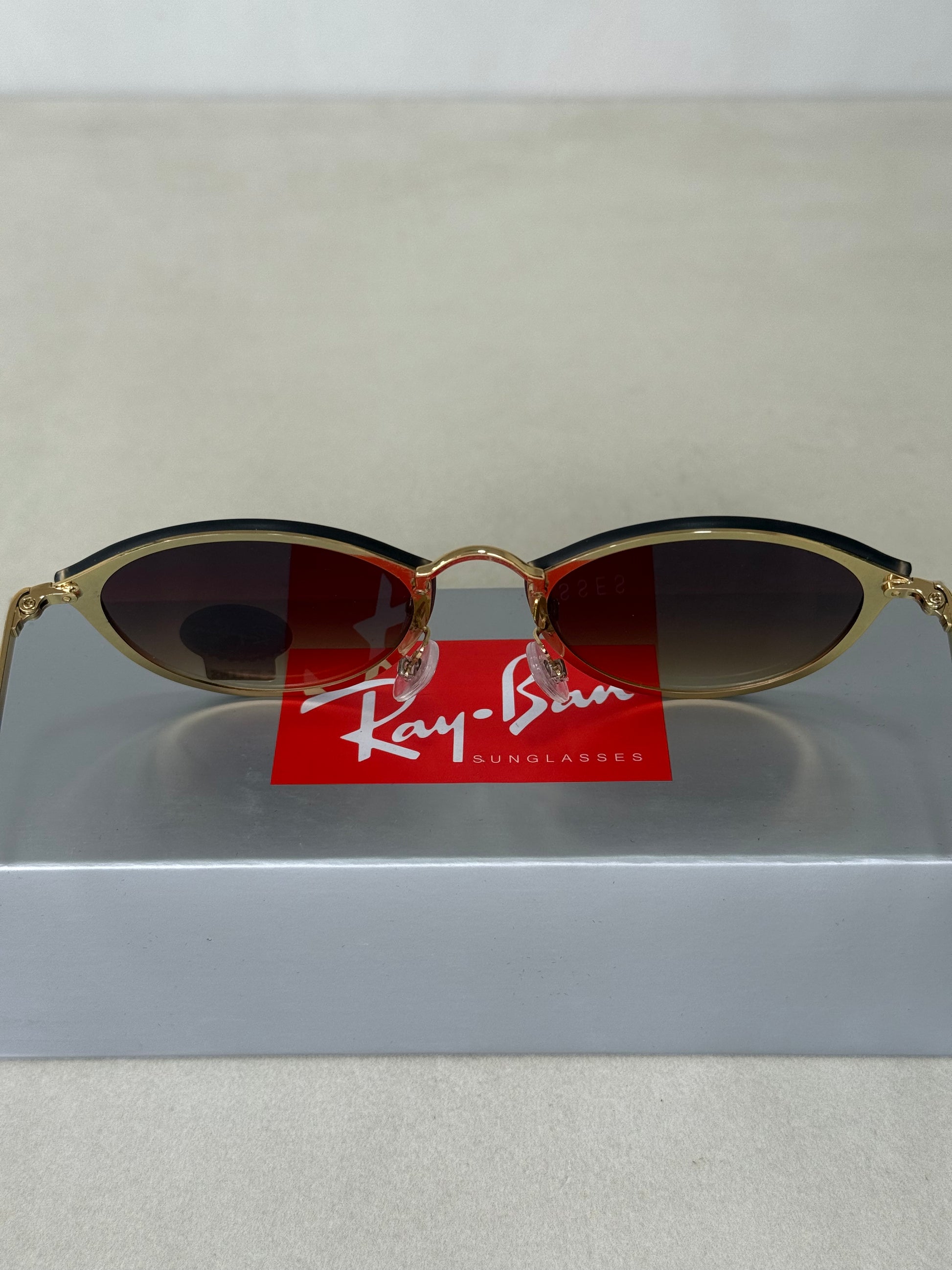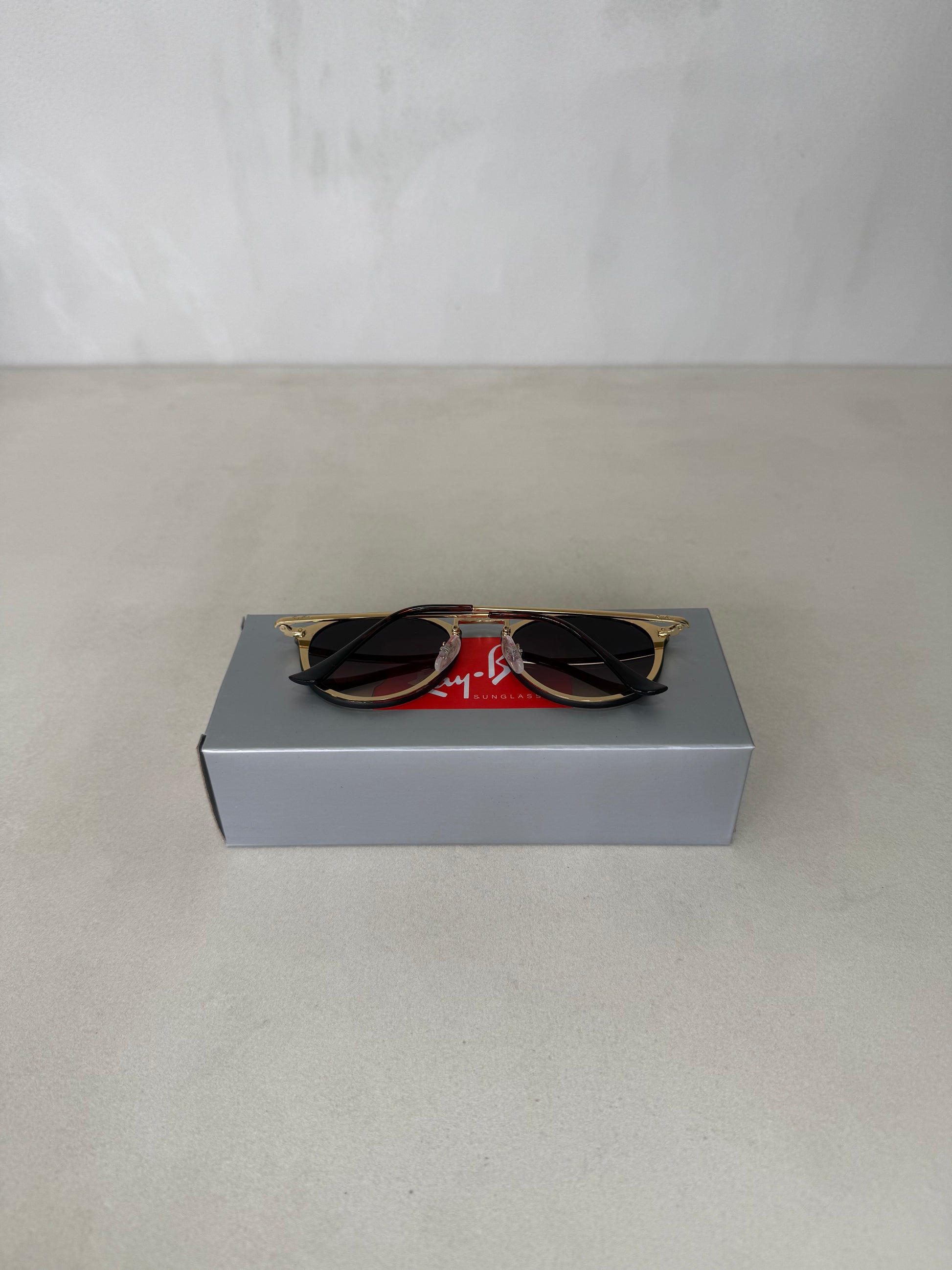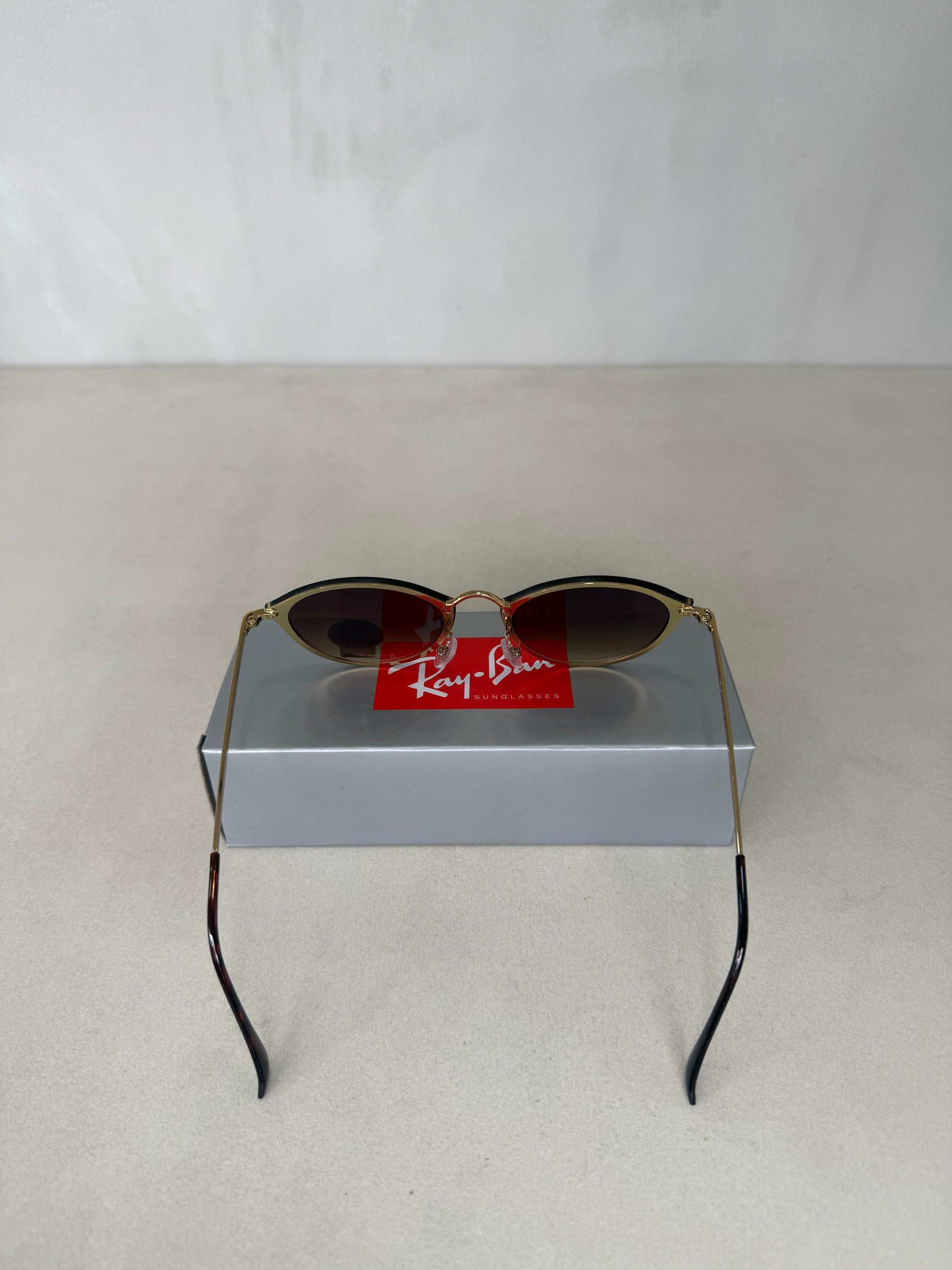 Acabados y detalles: logotipo Ray-Ban estampado discretamente en la lente derecha y detalles metálicos pulidos; incluye estuche oficial y paño de limpieza.
